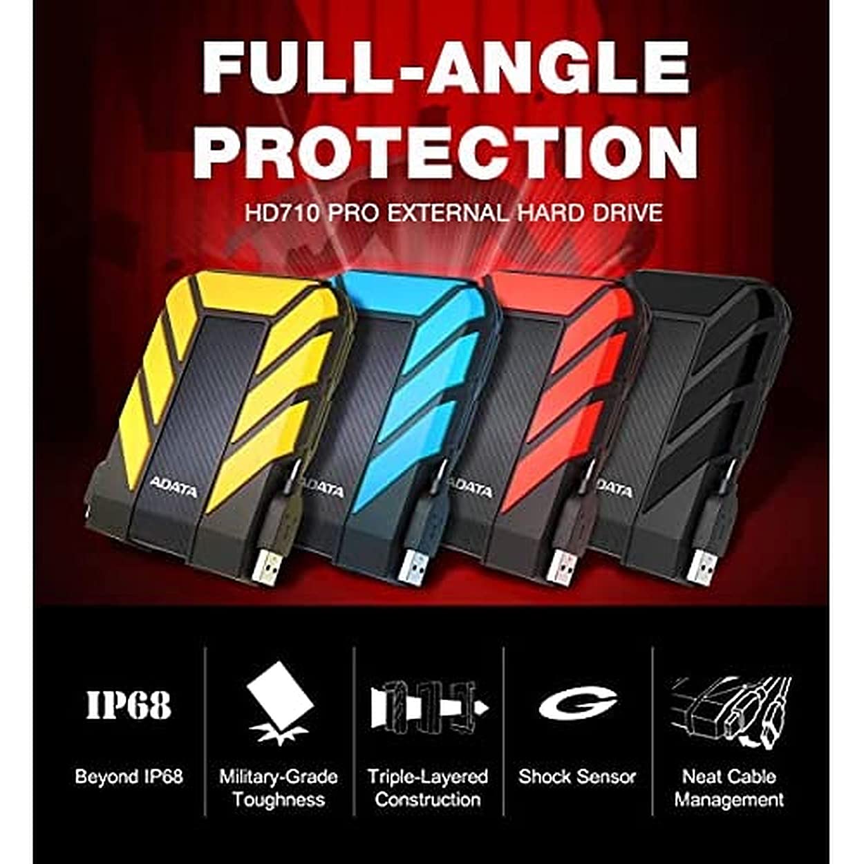 Your data is safeguarded with AHD710P-5TU31-CBK. It incorporates advanced data protection technologies, including shock sensors and a G-Shock Sensor Protection mechanism, which automatically initiates data protection by temporarily suspending data transfer if the drive detects sudden impacts or vibrations.