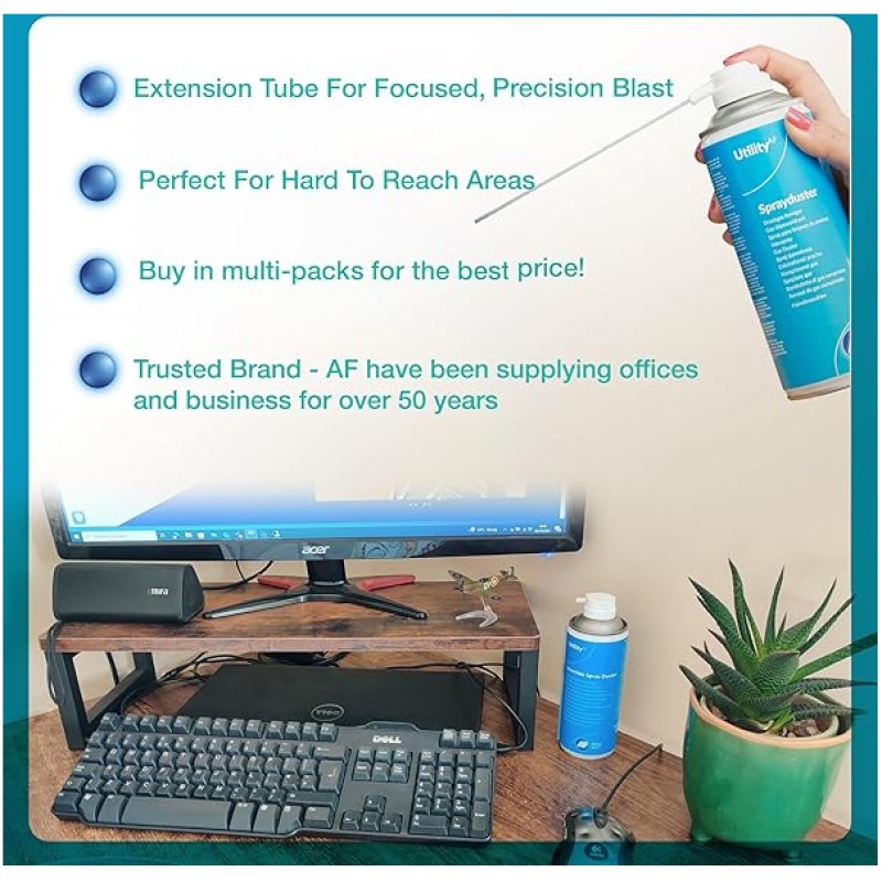 • AF Utility Sprayduster / Air Duster Compressed Gas Can – HFC Free – Flammable – Non-Invertible (May only be used in upright position) Effectively removes dust and crumbs build up from hard to reach areas of equipment including keyboards, printers, photocopiers, fax machines, cameras and much more.