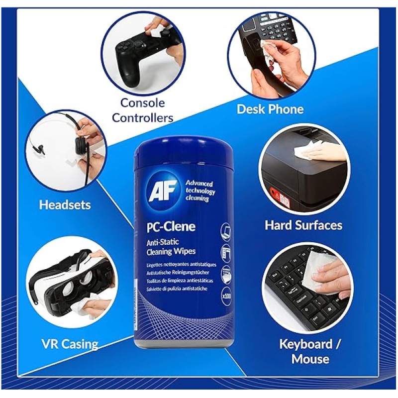 AF Anti Static PC Cleaning Wipes - for PC & Laptop Hard Surfaces, Desk, Desk Phone, VR, Headset, Games Console & Controller, Printers & More.