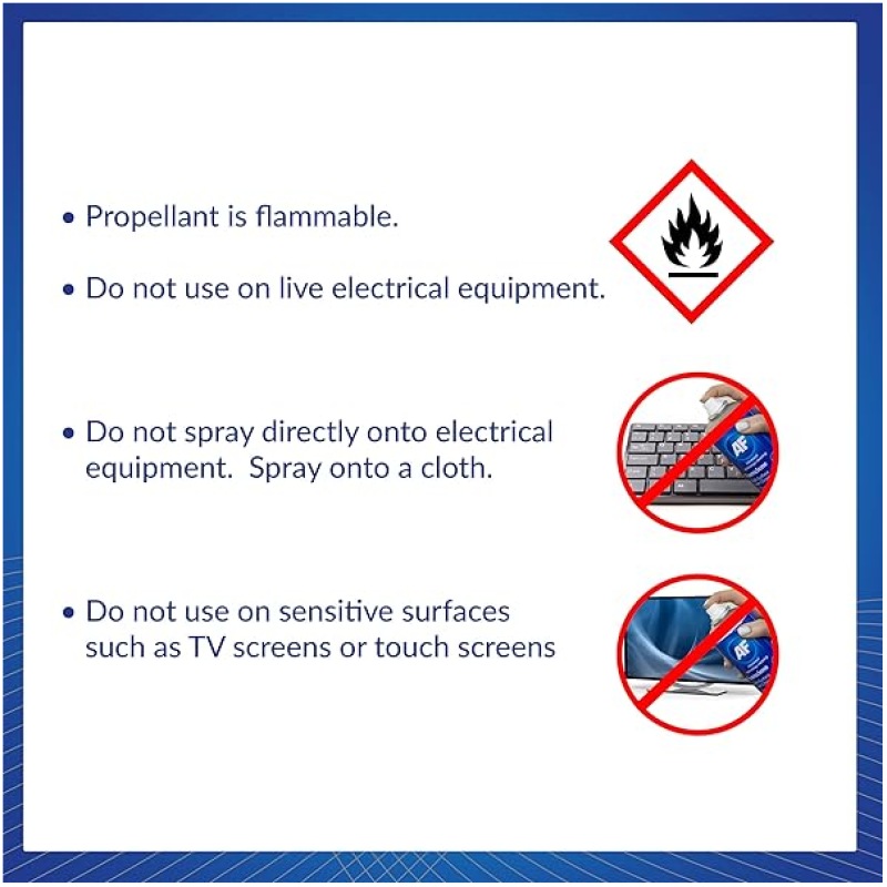 • Do not use on any type of screen including TFT, LCD, Smart TV’s or screen filters. This product is not suitable for polished wood. Avoid electrical contacts. Test first