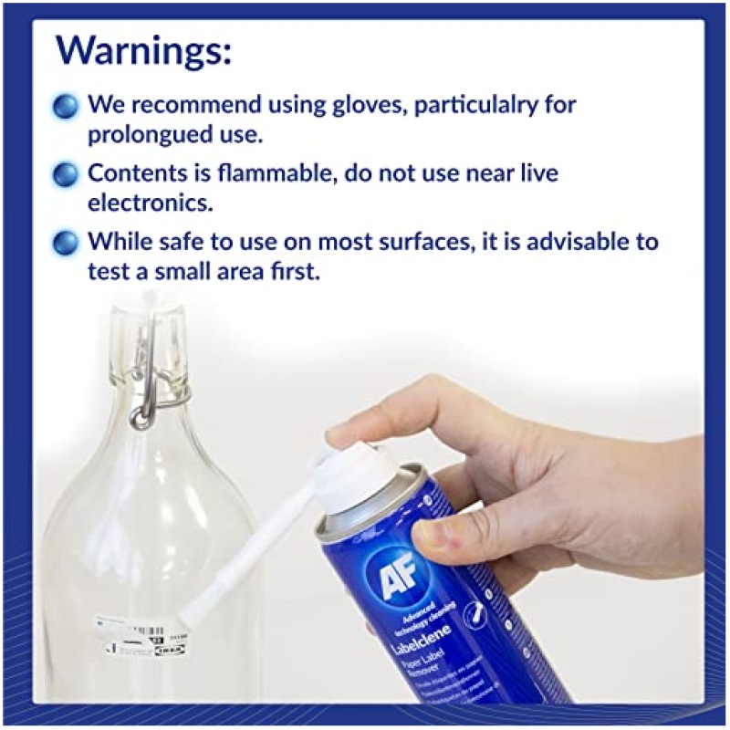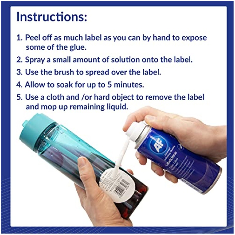 • EASY TO USE – 200ml spray can includes brush applicator tool. For plastic or coated labels, peel as much of the label off as possible before use. Spray small amount onto the label and leave to soak and dissolve the glue. Wipe away with dry cloth.