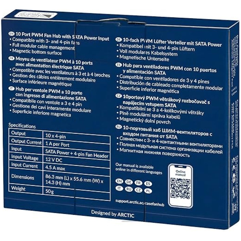 - TECHNICAL DETAILS: Output: 10 x 4-pin PWM Socket, Output Current: up to 1 A per Port, Input: SATA Power + 4-pin Fan Header, Input Current: up to 4.5 A, Dimensions: 55.6 x 86.3 x 14.3 mm, Weight: 50 g