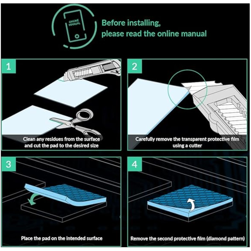- PLEASE NOTE: Due to the extremely low hardness of thermally conductive pads, a more demanding installation is to be expected. Please refer to the User Manual