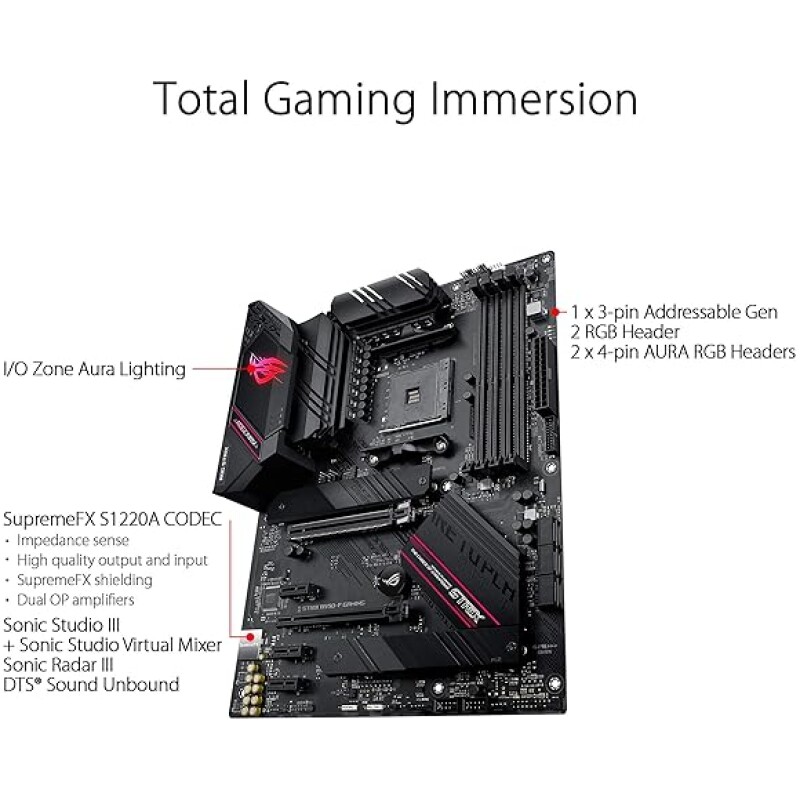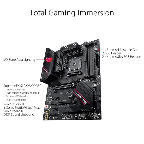 - Industry-leading Gaming Audio & AI Noise Cancelling Mic Technology: High fidelity audio from a SupremeFX S1220A codec with DTS Sound Unbound and Sonic Studio III draws deeper into the action. Communicate clearly with ASUS AI Noise Cancelling Mic technology