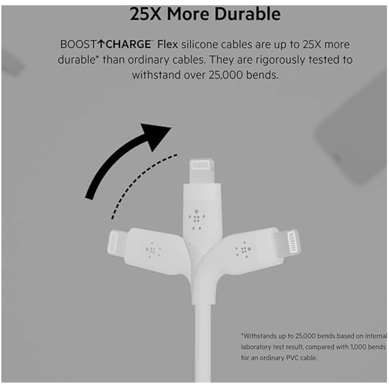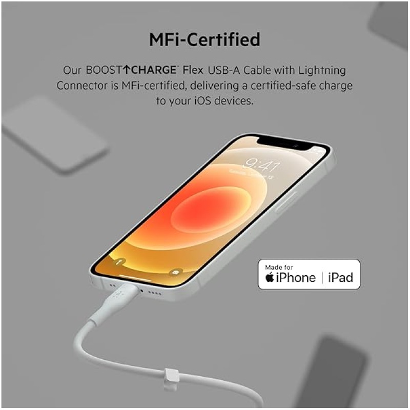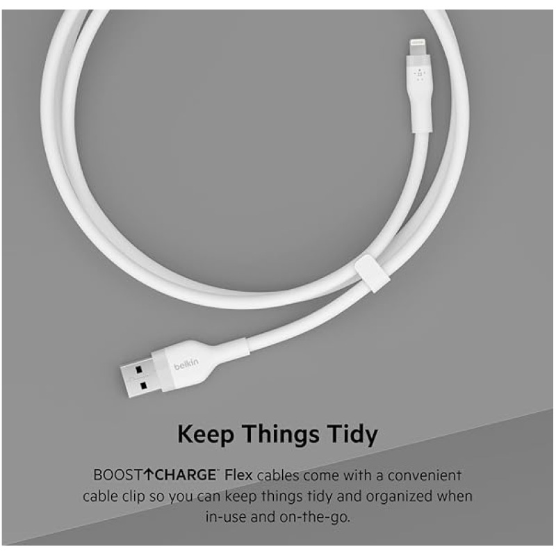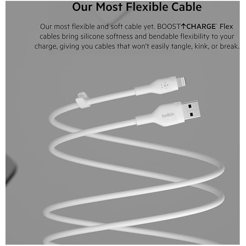 Belkin BoostCharge Flex Silicone USB Type A to Lightning Cable (2M/6.6FT), MFi Certified Charging Cable for iPhone 14/14 Plus, 13, 12, Pro, Max, Mini, SE, iPad and More ? White