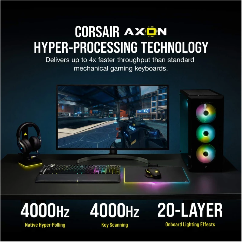 - Powered by CORSAIR AXON Hyper-Processing Technology: CORSAIR’s most advanced gaming keyboard experience delivers up to 4x faster throughput with native 4,000 Hz hyper-polling and 4,000 Hz key scanning