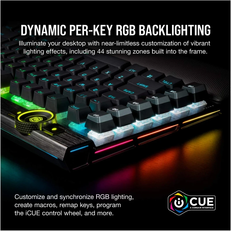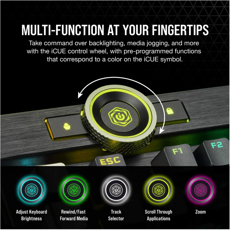 - Multi-Function at Your Fingertips: Take command over backlighting, media jogging, and more with a versatile iCUE control wheel, fully programmable to perform actions in games and applications