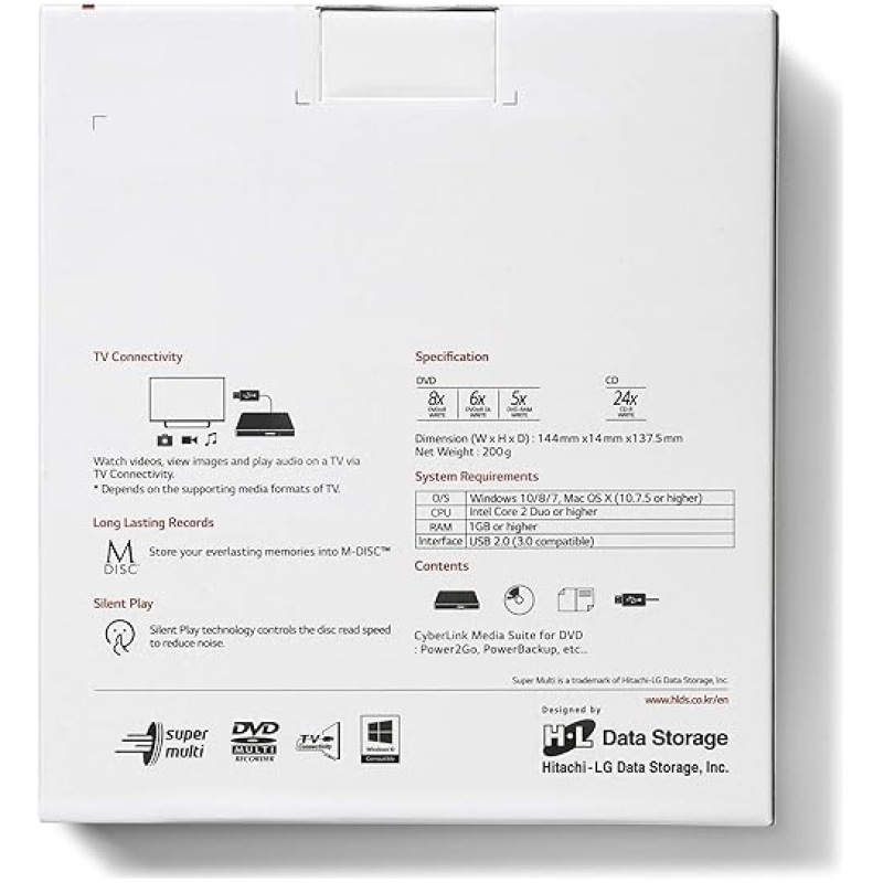 Hitachi-LG GP60 External DVD Drive, Slim Portable DVD Burner/Writer/Player for Laptop, Windows and Mac OS Compatible, USB 2.0, 8x Read/Write Speed – White