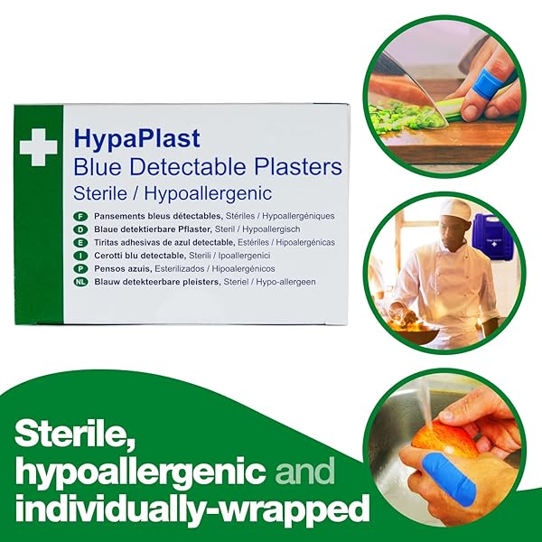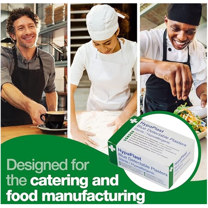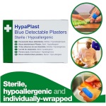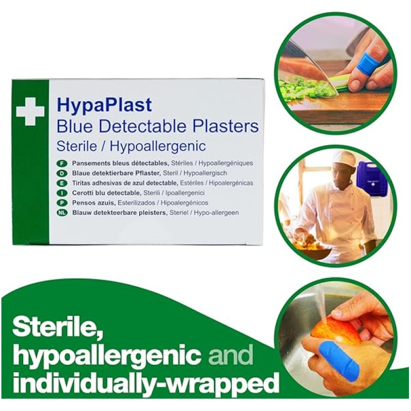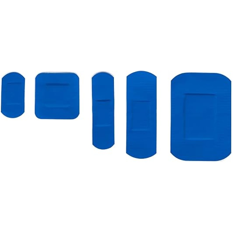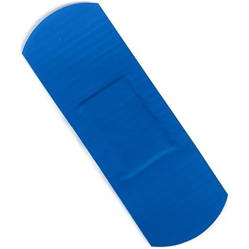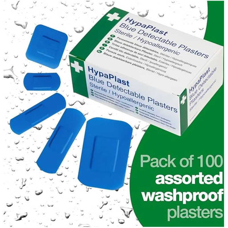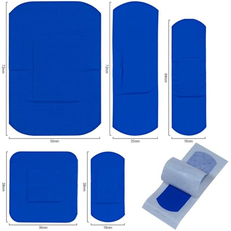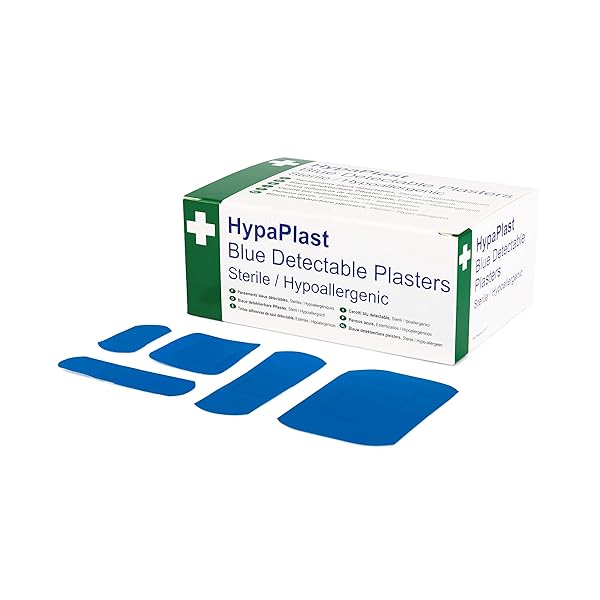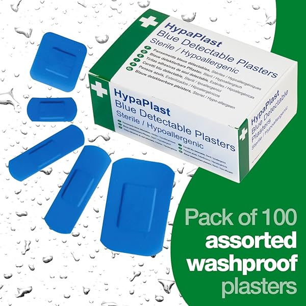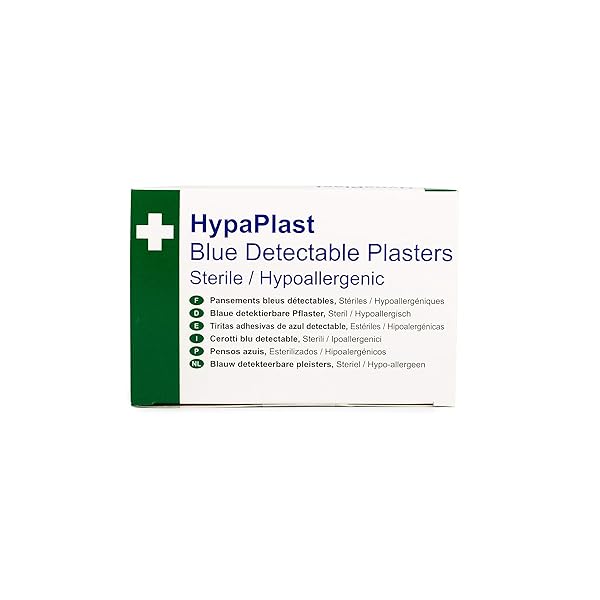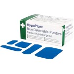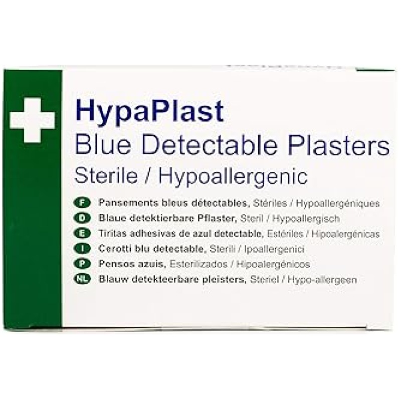 - Individually wrapped sterile blue plasters with detectable metal strip