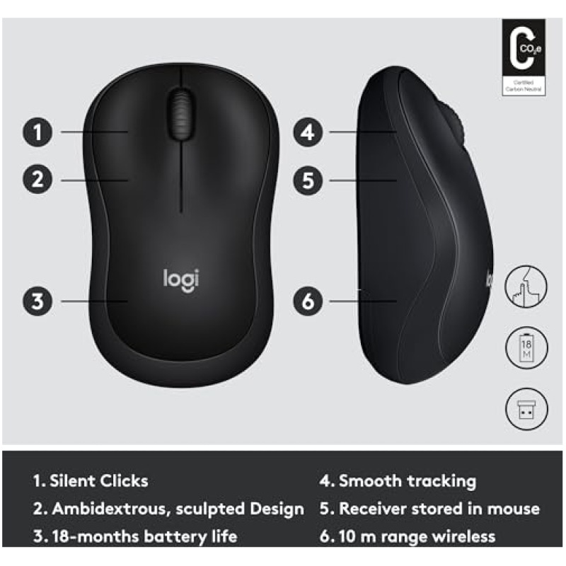 Logitech M220 SILENT Wireless Mouse, 2.4 GHz with USB Receiver, 1000 DPI Optical Tracking, 18-Month Battery, Ambidextrous, Compatible with PC, Mac, Laptop – Black