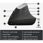- Rechargeable battery with Quick-Charging : MX Vertical wireless ergonomic mouse stays powered for up to four months on a full charge ? and gets up to three hours of use from a one-minute quick charge