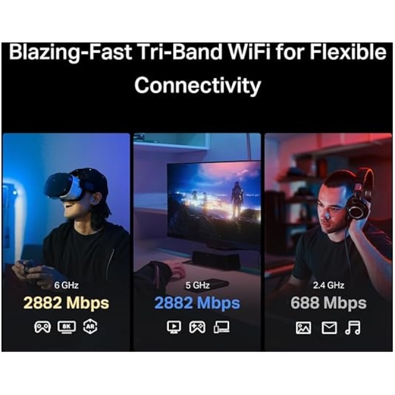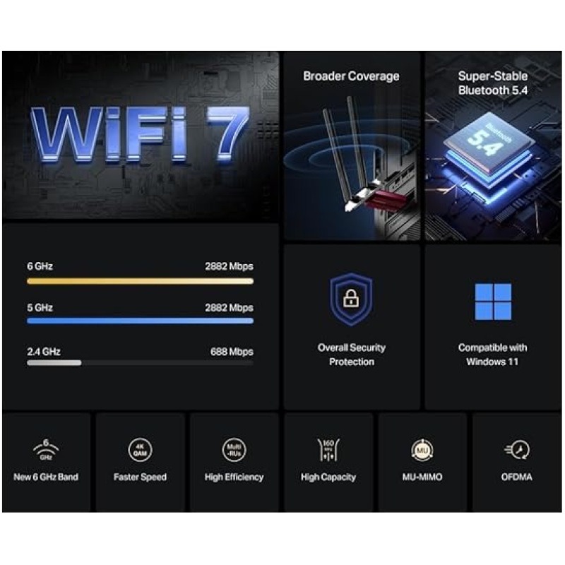 - Unparalleled Tri-Band Speed ? This high-performance WiFi card delivers ultra-fast connectivity with combined speeds of up to 2882 Mbps (6 GHz) + 2882 Mbps (5 GHz) + 688 Mbps (2.4 GHz), ideal for streaming, gaming, and heavy multitasking