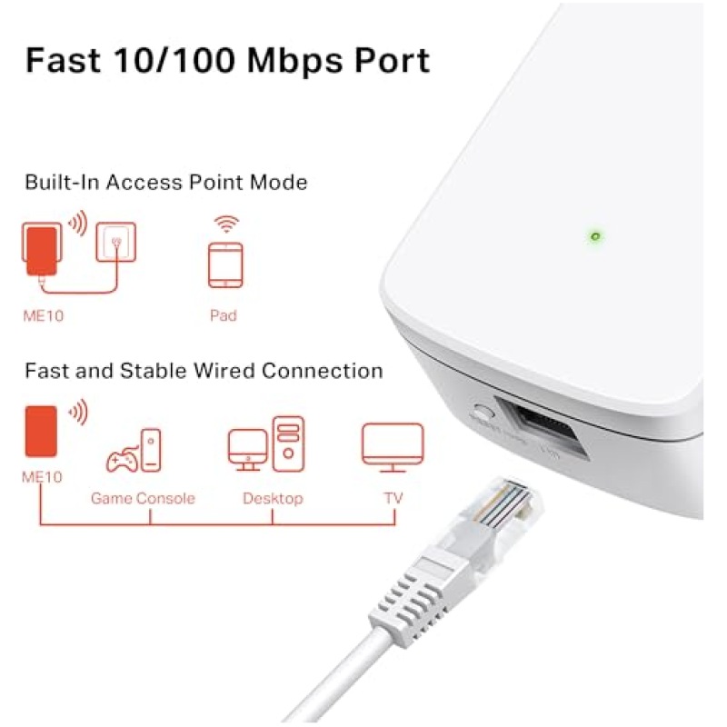 - Built-In Access Point Mode; ME10 is more than just a WiFi range extender; Connect your wired internet connection to the ME10 via Ethernet cable to turn it into a WiFi access point