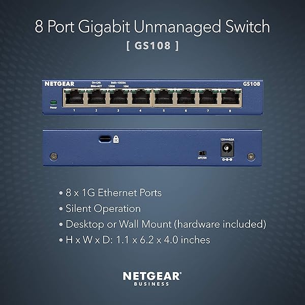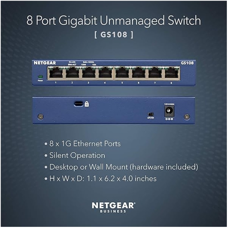 NETGEAR 8 Port Gigabit Network Switch (GS108) – Ethernet Switch – Ethernet Splitter – Plug-and-Play – Silent Operation – Desktop or Wall Mount