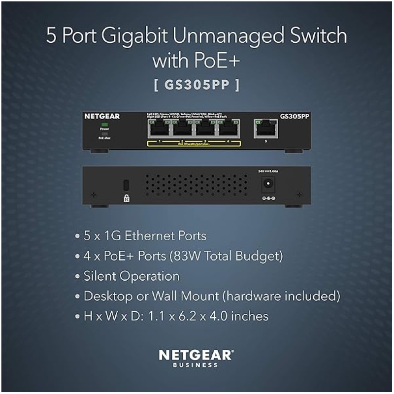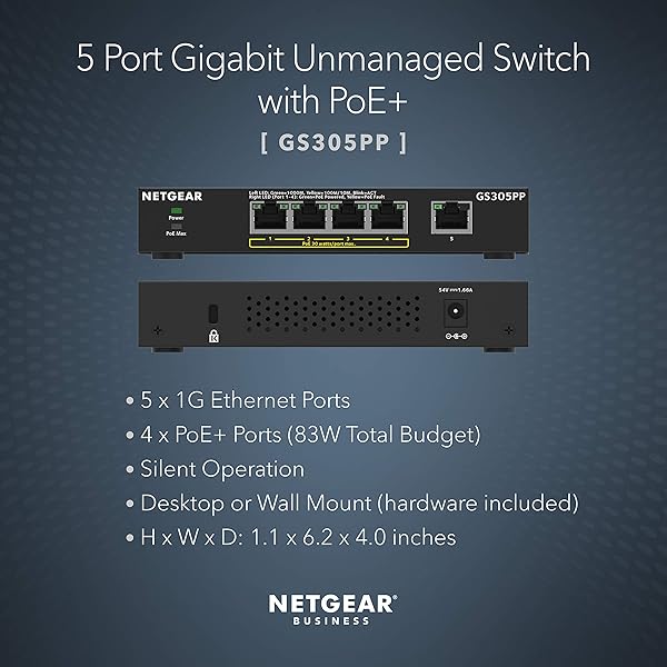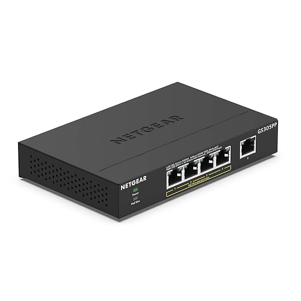 NETGEAR PoE Switch 5 Port Gigabit Ethernet Unmanaged Network Switch (GS305PP) with 4 x PoE Plus at 83 W, Desktop or Wall Mount