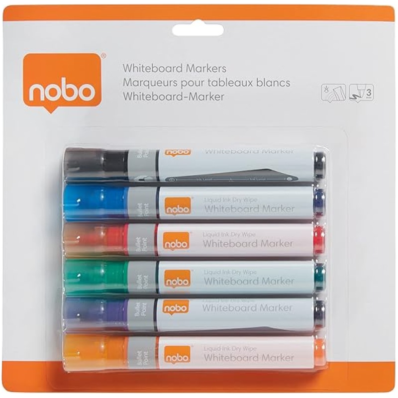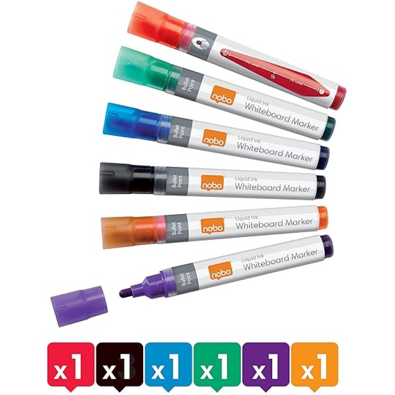 • Contents: 6 x Nobo Liquid Ink Drywipe Whiteboard Pens, Coloured, 1901419