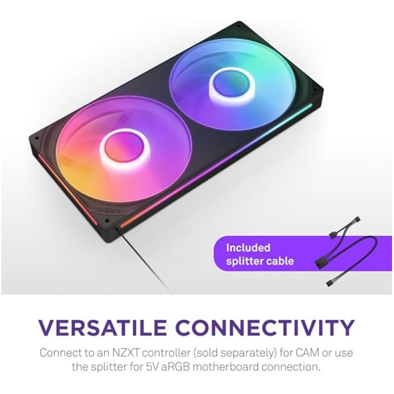 - VERSATILE CONNECTIVITY ? Simply connect a single cable to an NZXT controller (sold separately) for lighting and speed control via NZXT CAM software. Or, connect to any motherboard using the included splitter cable.