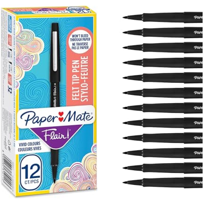 Paper Mate Flair Felt Tip Pens | Medium Point (0.7 mm) Writing Pens | Black Pens | For Writing, Drawing & Sketching | 12 Count