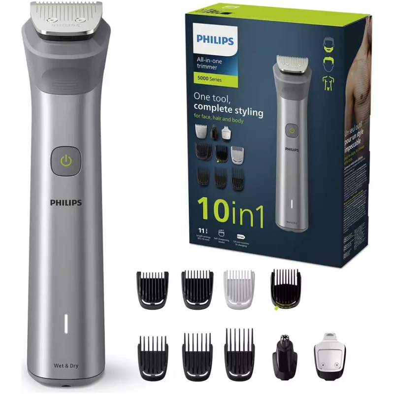 • 10 attachments: Steel trimmer, Steel precision trimmer, Nose and ear trimmer, 2 stubble combs, 3-7 mm adjustable comb, 3 hair combs, 1 body comb.