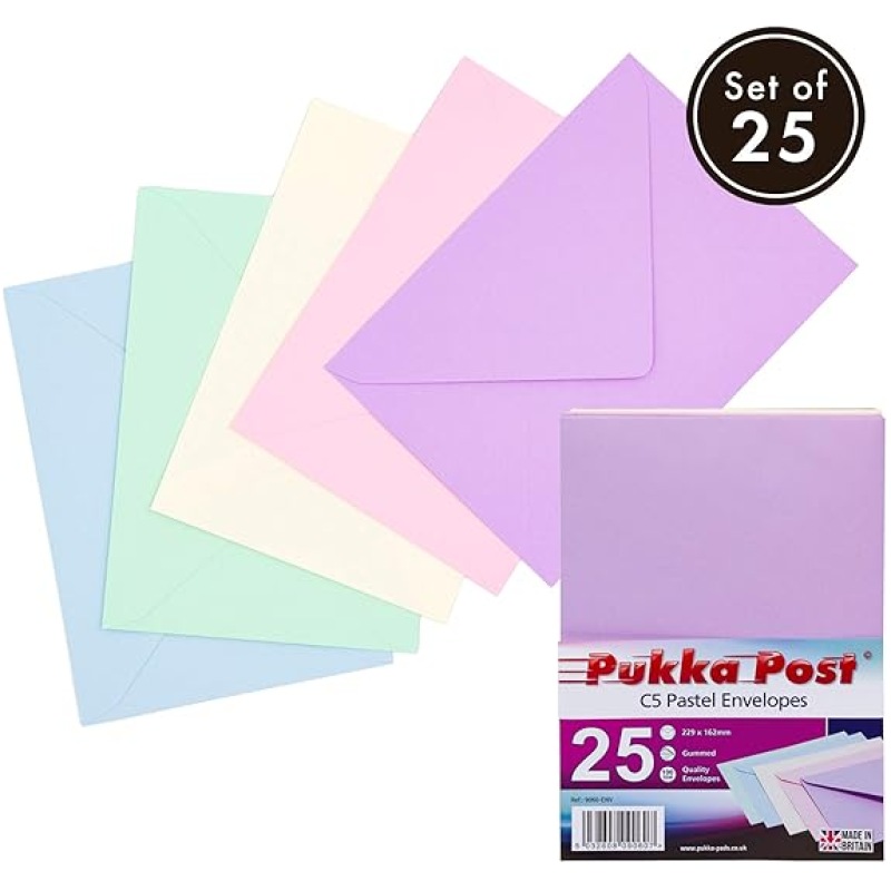 Pukka Pad, Pukka Post & Packaging Gummed Envelopes – Pack of 25, Ready-to-Seal, Durable 100GSM Postal Envelopes for Letters, Invitations, and Other Mail – 229 x 162 mm, Size C5, Pastels