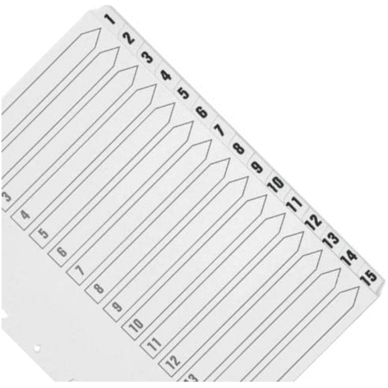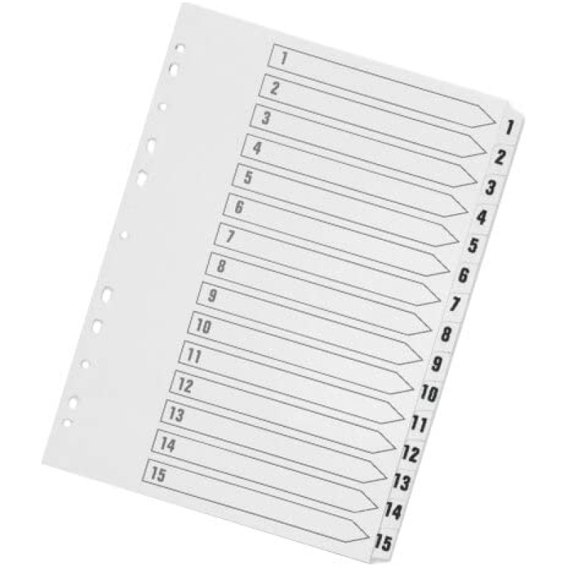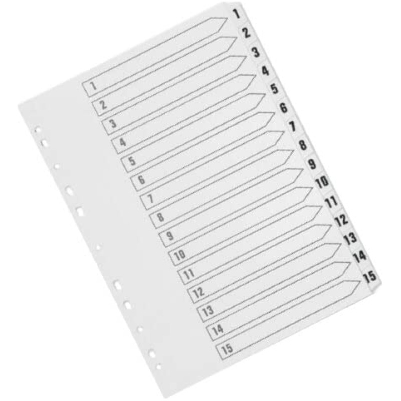 • This Q-Connect 1-15 numbered index divider provides a clear and simple filing solution for your everyday office needs. The front index sheet provides space for labelling to make referencing your notes quick and easy. Made from plain white board with clear tabs that are Mylar-coated for extra reinforcement, this index comes with pre-printed tabs (1-15) and is multi-punched to fit standard A4 lever arch files or ring binders