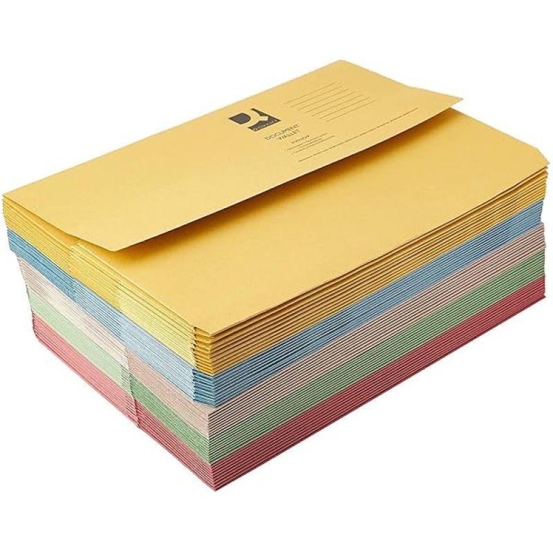 - This environmentally friendly Q-Connect document wallet is made from 100% recycled, 285gsm manilla with a 30mm capacity for filing A4 or foolscap documents. Ideal for home, office, or classroom use, this assorted pack contains 50 document wallets, with 10 each of blue, buff, yellow, green and red