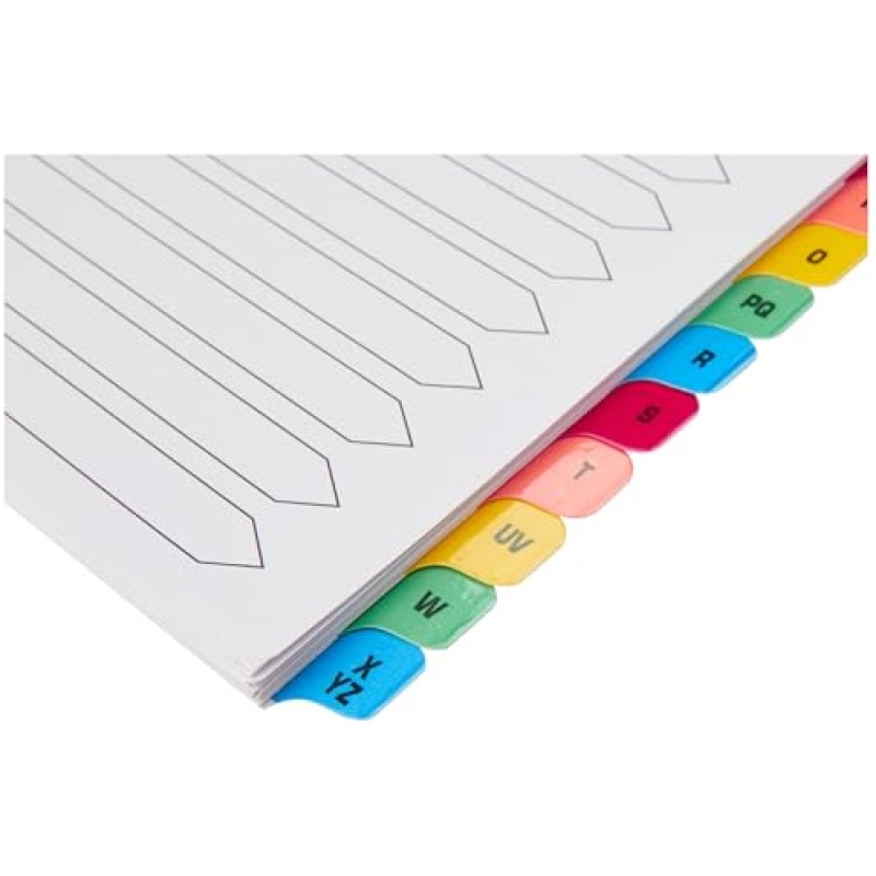 - This Q-Connect A-Z index divider provides a clear and simple filing solution for your everyday office needs. The front index sheet provides space for labelling to make referencing your notes quick and easy. Made from plain white card with multi-coloured Mylar tabs for extra reinforcement. This 20 part index comes with pre-printed tabs (A-Z) and is multi-punched to fit standard lever arch files or ring binders