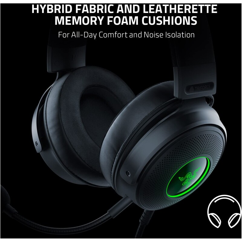 - Hybrid Fabric and Leatherette Memory Foam Cushions For All-Day Comfort and Noise Isolation. The snug, close-fitting earcups provide superior sound isolation and comfort, allowing you to game for hours in complete, uninterrupted immersion.