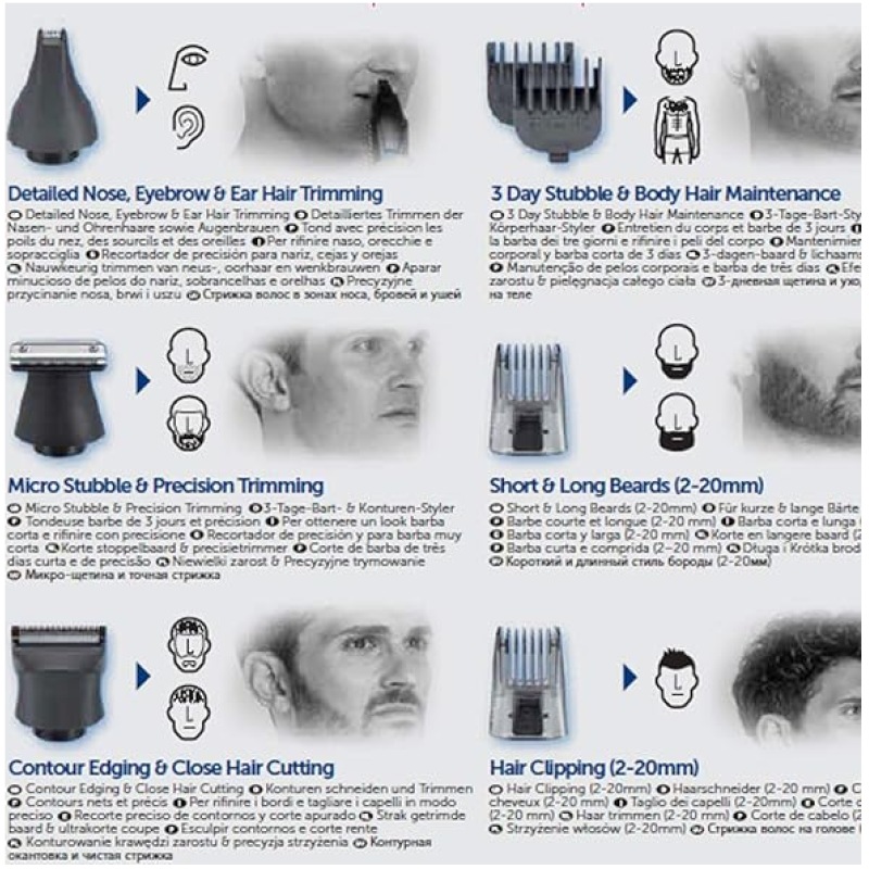 - Six attachments for 12 head to toe styles: Adjustable comb for beard and hair (2-20 mm); 1.5 and 3 mm fixed combs; 30 mm main blade; linear nose, ear and eyebrow trimmer and TST precision trimmer