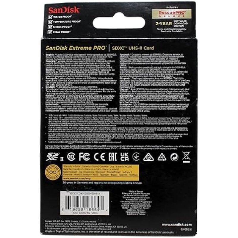 SanDisk 128GB Extreme PRO SDXC card, SD Card, V90 Memory Card, 8K, 4K and Full HD Video, up to 300 MB/s, Shock, Temperature, Water and X-Ray Proof, UHS-II, Class 10, U3,