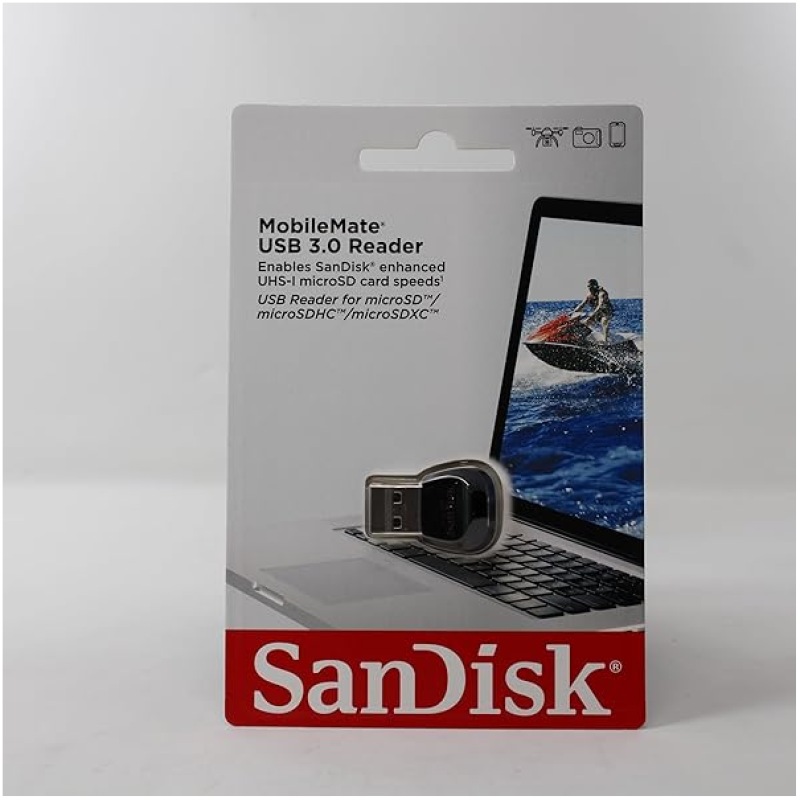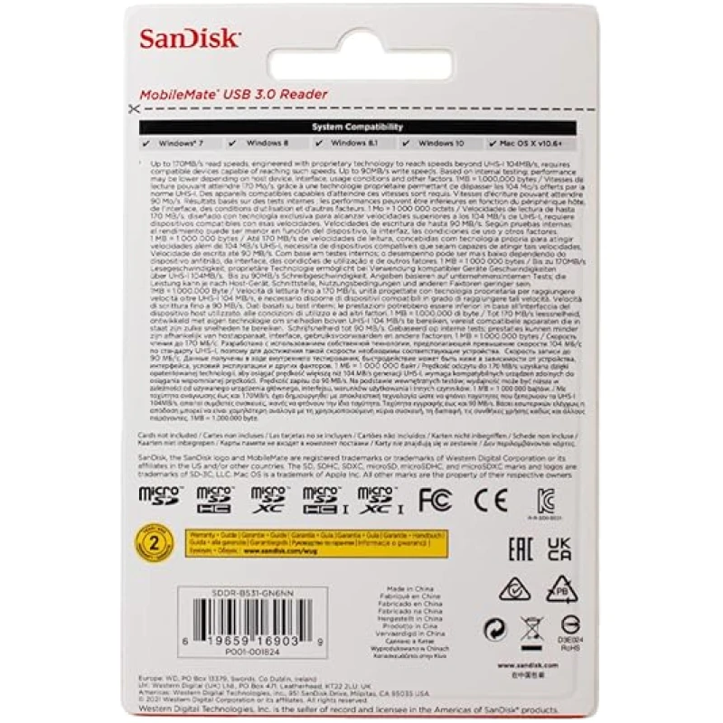 • Box contents SanDisk MobileMate USB 3.0 card reader (for microSD memory cards, compact and robust design, backwards compatible with USB 2.0, 170 MB/s transfer) 2-year warranty