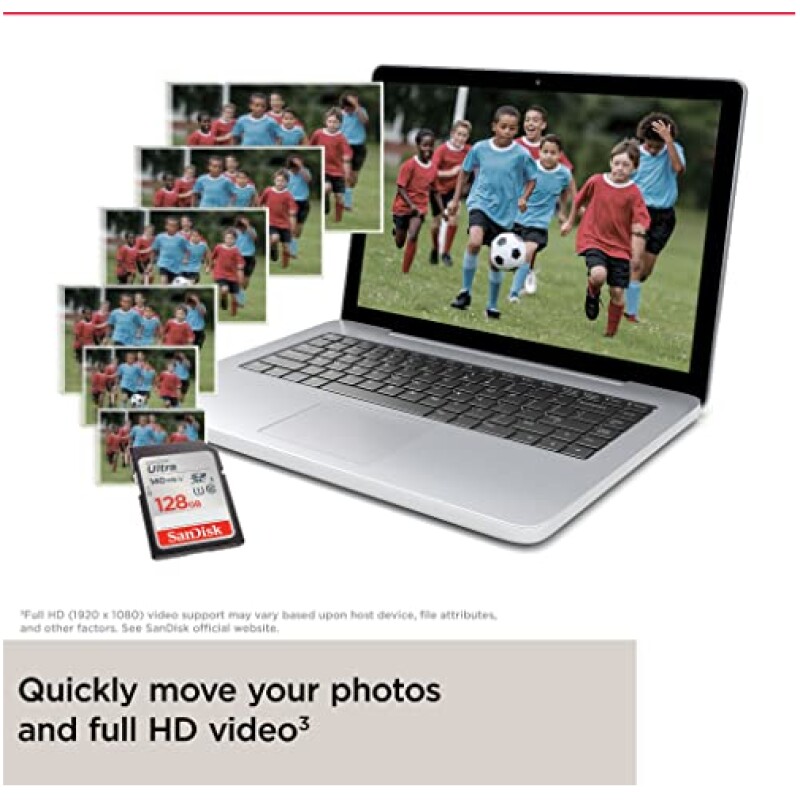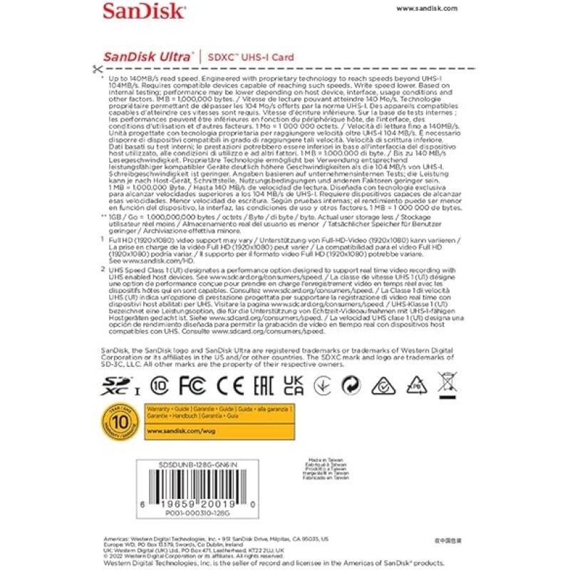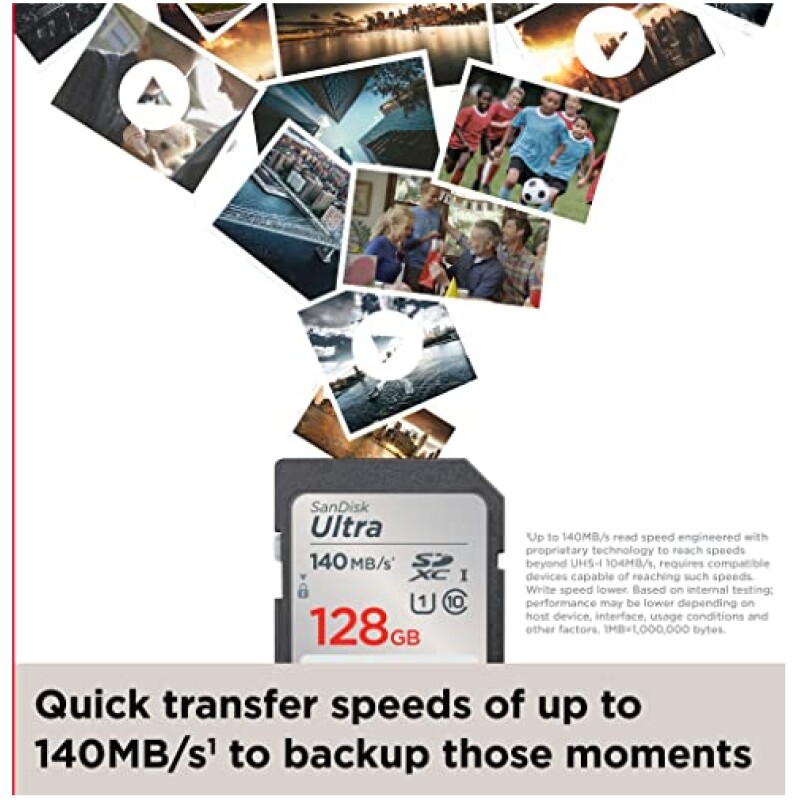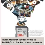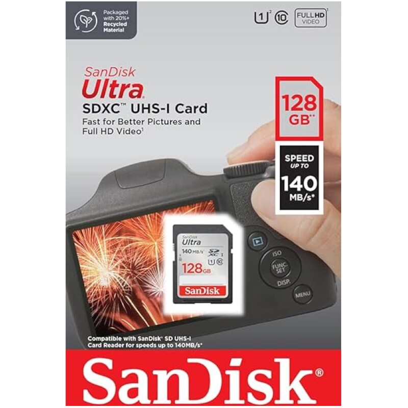 SanDisk Ultra SDXC card, 128GB SD Card (Memory card up to 140 MB/s read speeds, For entry level and mid-range compact camera's, Full HD Video, UHS-I, Class 10, U1)