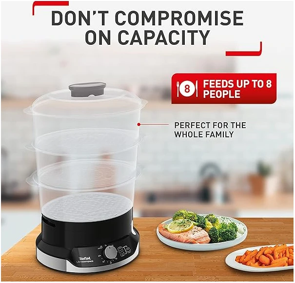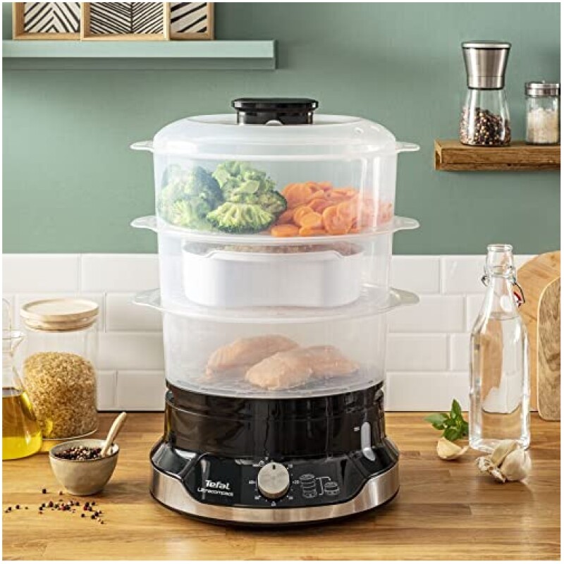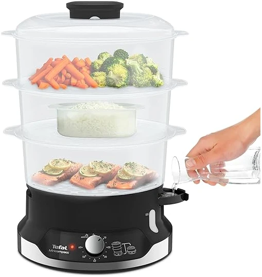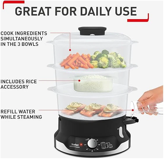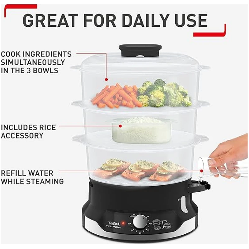 Tefal Ultracompact Steam Cooker, 9L, Stackable Storage System, 3-Tier Food Steamer, BPA-Free Bowls, 60-Min Timer, Refill While Steaming, Rice Accessory, Removable Cooking Bowls,VC204865