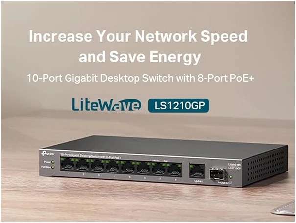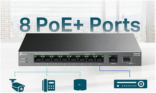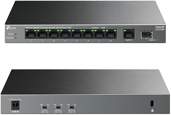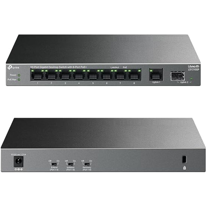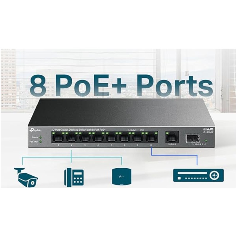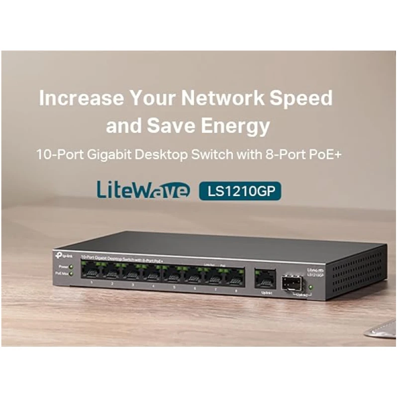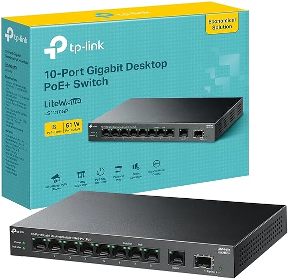 TP-Link 10-Port Gigabit Desktop Switch with 8-Port PoE+, 61 W PoE Budget, 30 W PoE output, Up to 250m PoE Transmission. Traffic Separation, Plug and Play, Fanless, Metal Case (LS1210GP)