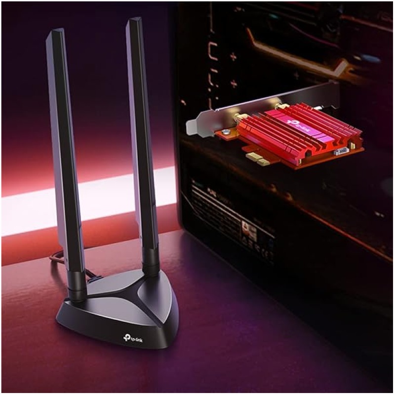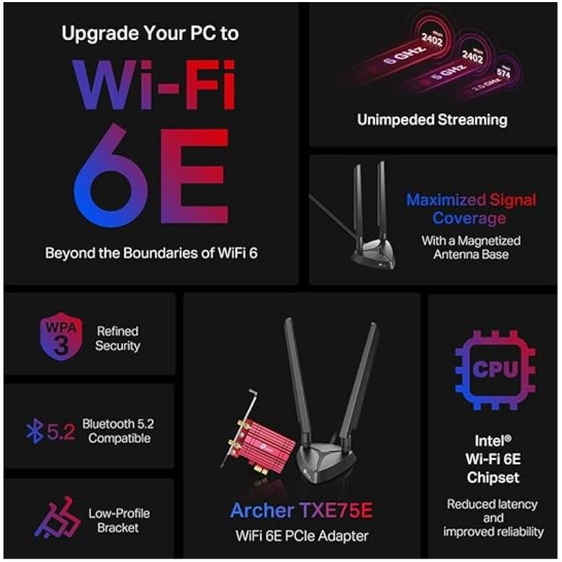 TP-Link AXE5400 Tri-Band Wi-Fi 6E Bluetooth 5.2 PCI Express Adapter with Two Antennas, Intel Wi-Fi 6E Chipset, Magnetized Antenna Base, Low-Profile Bracket Included, WPA 3 (Archer TXE75E)