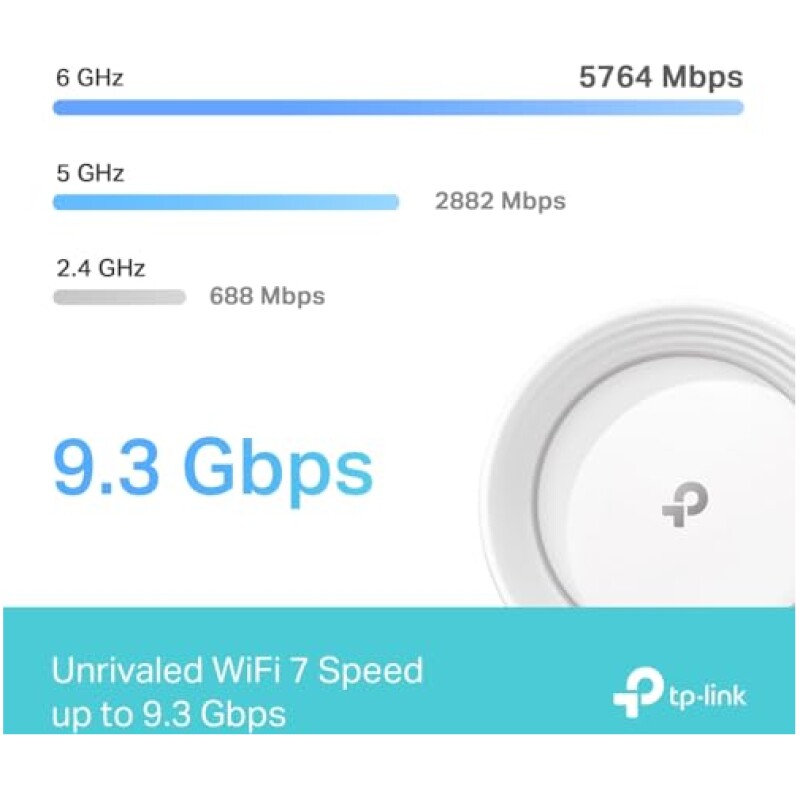 - WiFi 7 Mesh speed – 9.3 Gbps Tri-Band WiFi 7 – 5765 Mbps (6 GHz) + 2882 Mbps (5 GHz) + 688 Mbps (2.4 GHz)