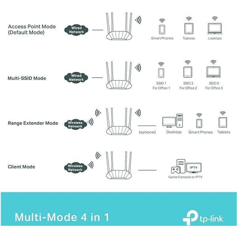 - Multiple Modes ? Supports Access Point, Range Extender, Multi-SSID, and Client modes to meet any network needs.