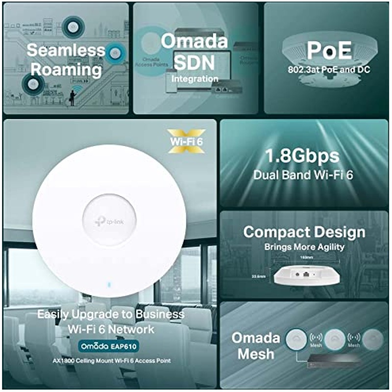 TP-Link EAP610 Access Point, AX1800 Wi-Fi 6 Dual Band Gigabit Wireless Access Points, Omada Mesh, Support PoE+Powered or DC, Easily Mount to Wall or Ceiling, Free EAP Controller Software