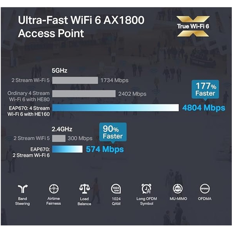 - Blazing-Fast WiFi 6 Speeds (574 Mbps on 2.4 GHz + 4804 Mbps on 5 GHz)