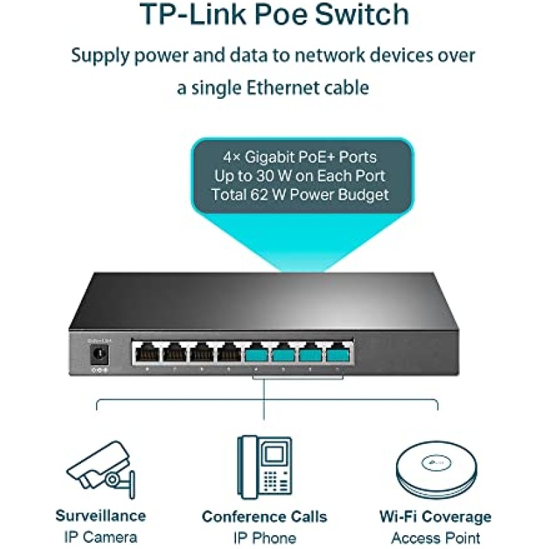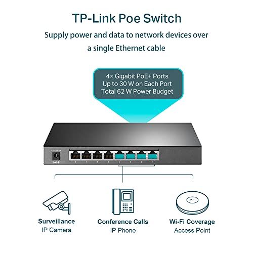 - 62 W PoE Budget and full Gigabit Ports: 4?802.3at/af-compliant PoE+ ports with a total power supply of 62 W, 4? gigabit PoE+ ports and 4? gigabit non-PoE ports provide high-speed connections