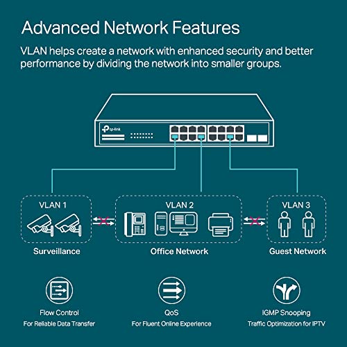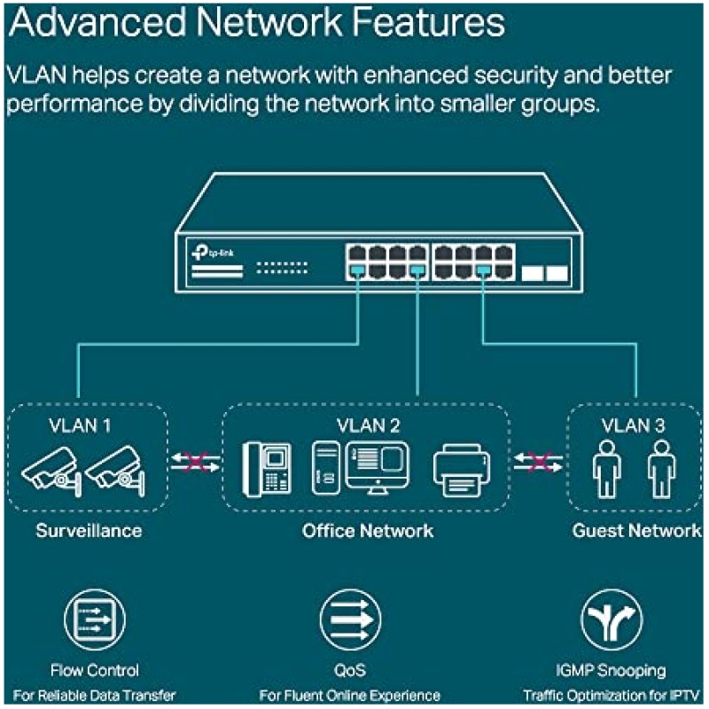 - Full Gigabit Ports: 16? gigabit RJ45 ports and 2? gigabit SFP Slots provide high-speed connections, L2/L3/L4 QoS and IGMP snooping help optimize Voice and Video Applications