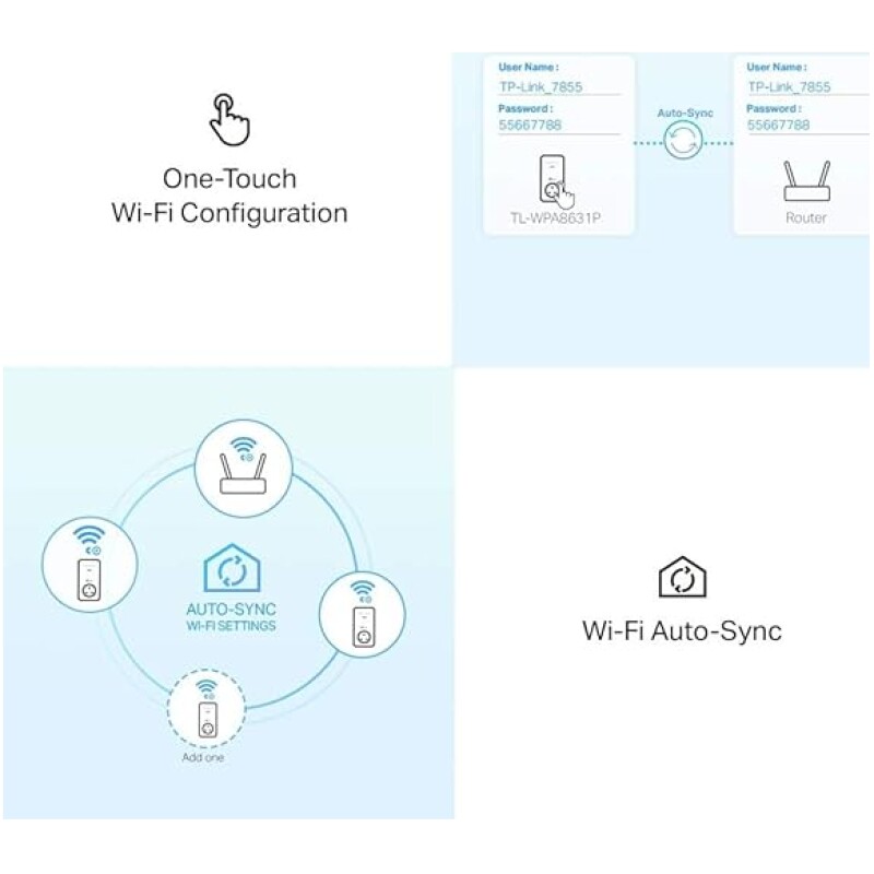 - Wi-Fi Auto-Sync – Instantly configures additional extenders to your powerline network by uniformly syncing settings such as SSID, password, Wi-Fi Schedule and LED schedule across all network device