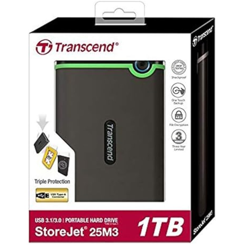 Transcend 1TB StoreJet 25M3S USB 3.1 Portable Hard Drive Rugged, Anti-Shock Resistant, Compact and Lightweight with Lightning-Fast Speeds and a One Touch Backup Button (Iron Grey) TS1TSJ25M3S