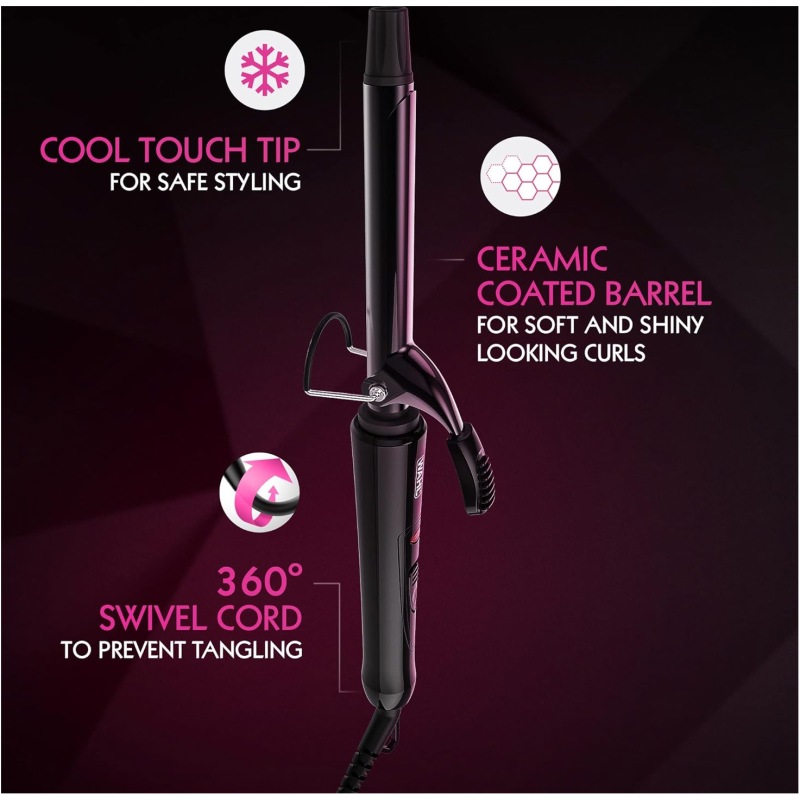 - COOL TOUCH TIP – This curling tong also features cool touch tip and a barrel clamp that securely holds the hair in place whilst wrapping the length around the tong for ease of use and safe styling