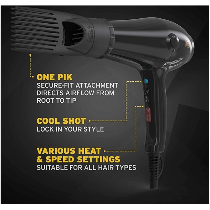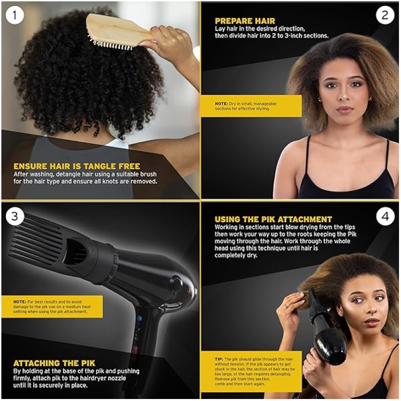 - FOR TEXTURED HAIR – Designed specifically for afro and frizzy hair for deep, effective drying. The secure fit pik attachment with long heat resistant teeth that assist in directing airflow to the root of the hair and throughout the entire hair length