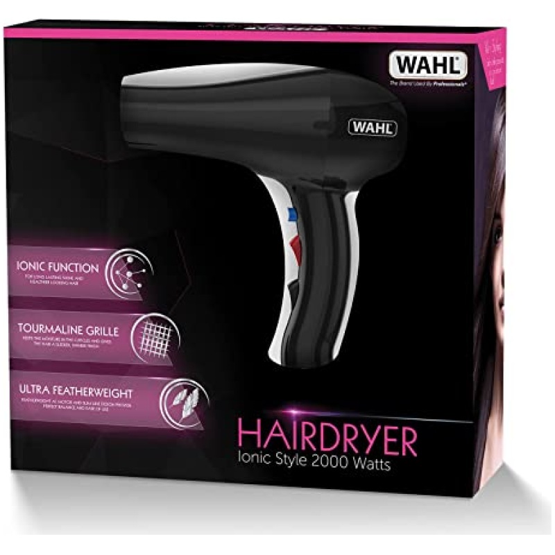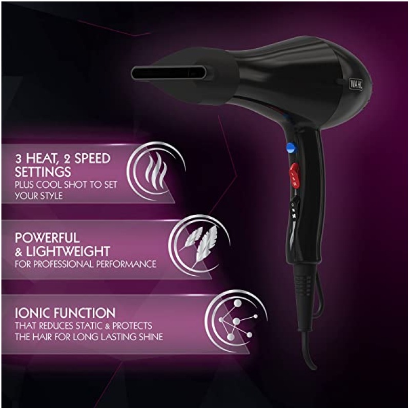 Wahl Ionic Style Hairdryer, Professional Quality Dryer, Hair Dryers for Women, Cool Shot Button, 3 Heat and 2 Speed Settings, Quick Dry Airflow, Fast Drying, Black