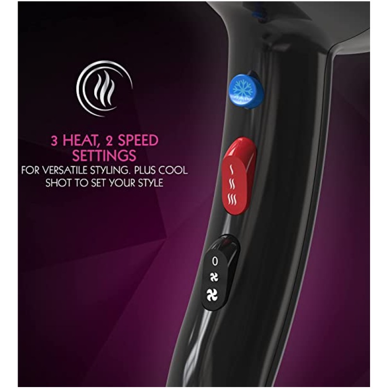 - VERSATILE STYLING – 3 heat and 2 speed settings for versatile styling options. Use the high speed and heat setting for drying hair quickly or the lower speed and heat for more styling control. Use the cool shot for a burst of cool air that seals the hair cuticle and locks in your style